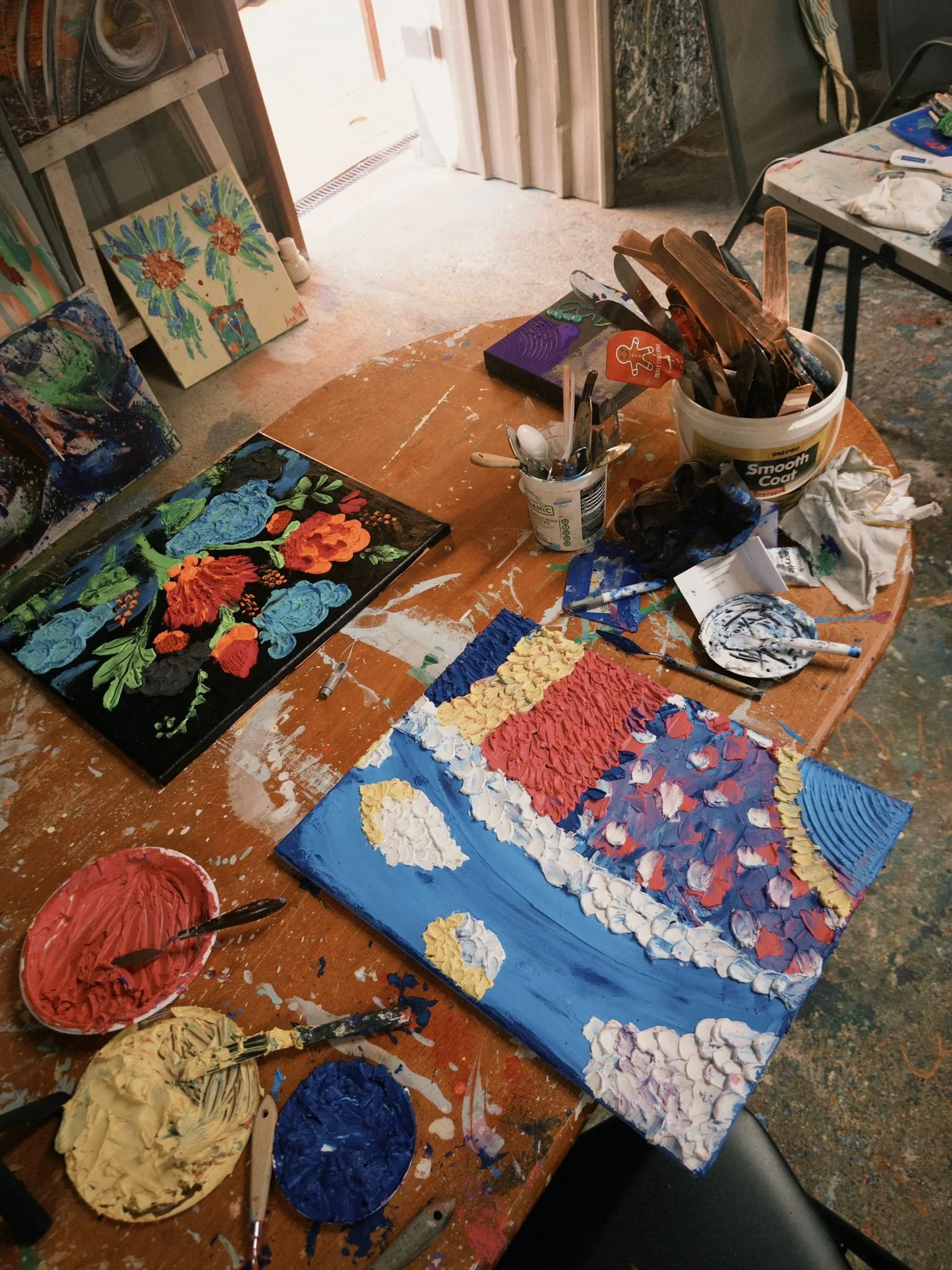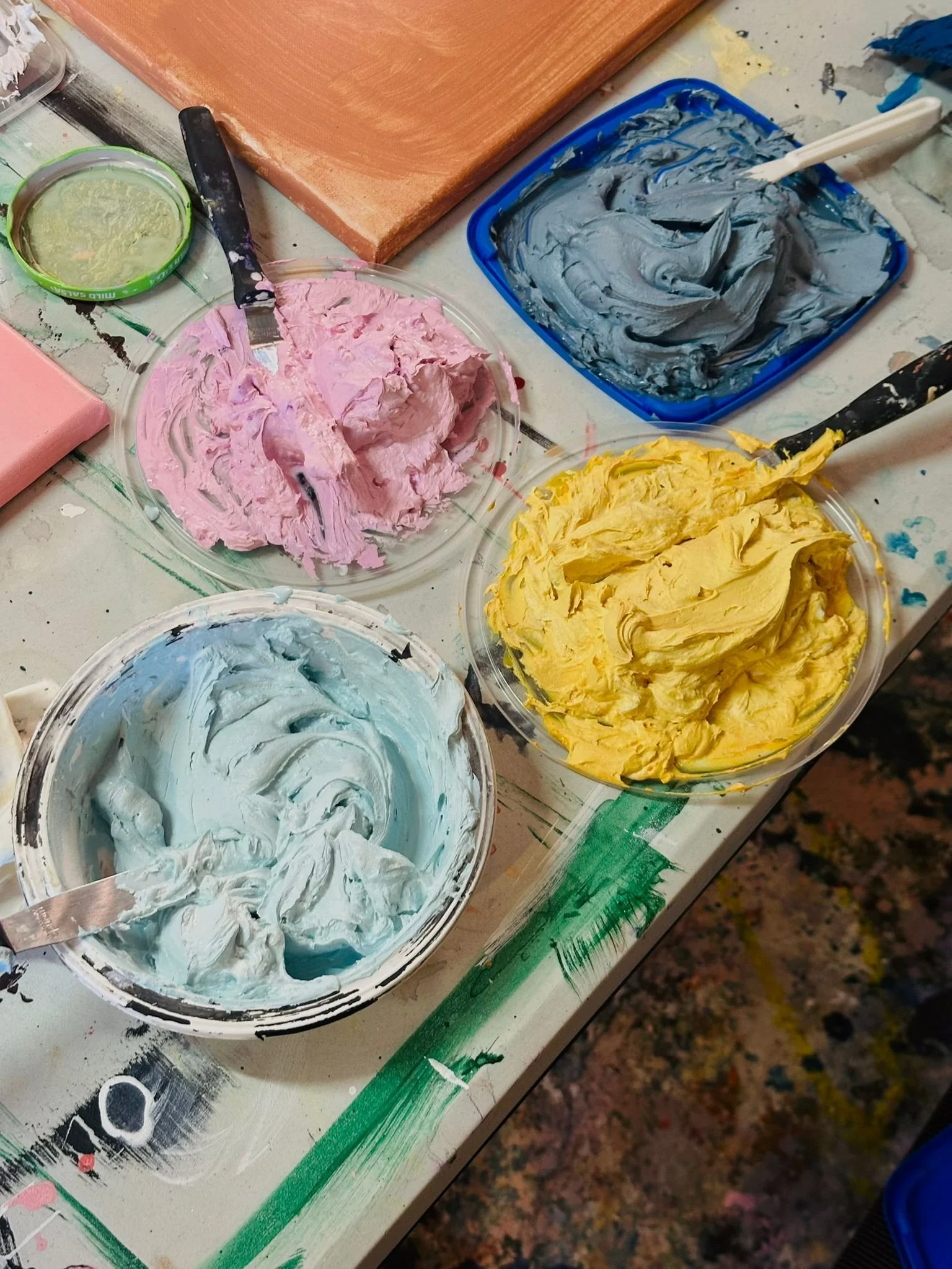 Importantly, these are not traditional paint-and-brush sessions. Participants work with flow mediums, acrylic pours, texture mediums, and gestural mark-making tools—including palette knives, spatulas, and unconventional implements—to build layered, expressive surfaces. The focus is not on technical precision, but on process-driven, contemporary abstract painting, where movement, material, and instinct lead the work.
